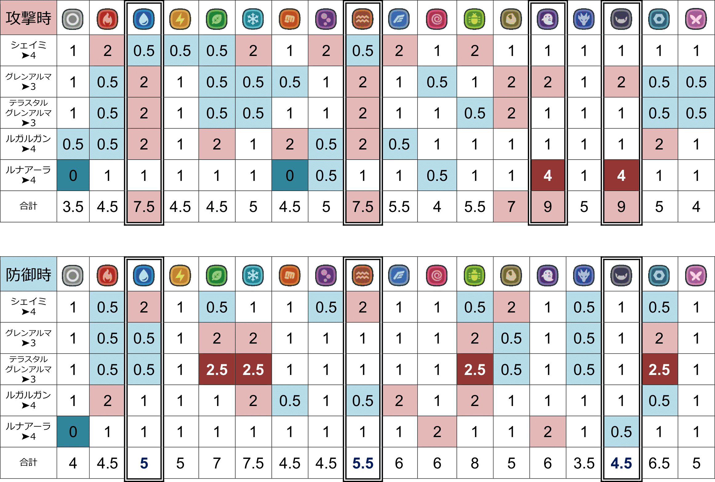 上の表は数字が大きいほうがダメージが通り、下の表は数字が小さいほうが被ダメージが減ります。(トレーナー側目線の表です)